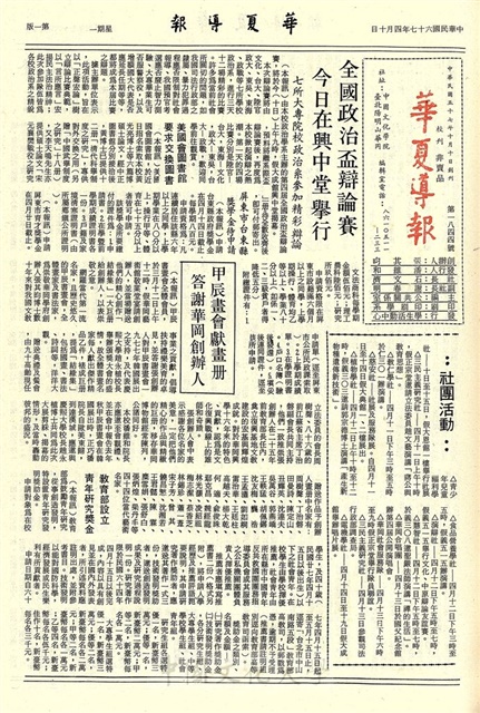 全國政治盃辯論賽今日在興中堂舉行,美國會圖書館要求交換圖書,屏東市台東縣獎學金待申請,甲辰畫會獻畫冊答謝華岡創辦人,教育部設立青年研究獎金,登山人的鈴聲,互助基金的深長意義,黨員互助基金之我見