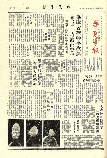 畢服會總幹事改選 明日十時截止登記,印刷學社攝影展覽,信誼育群獎學金,徵求致辭人員,新聞系校友吳惠美深造,畢業典禮預演有關人員參加,首屆上運盃硬式網球賽,大專盃釣技觀摩由我魚藝社主辦,體操錦標賽優勝者名單,鐵樹開花 三星獻瑞,第一屆華岡畢業詩畫展後記,新聞自由與新聞自律,華岡書城