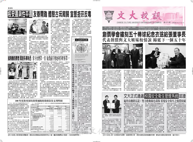 創價學會繡刻五十棒球紀念衣送給張董事長,文大正式通過校園安全衛生管理系統認證,致力校內軟硬體建設推展國際學術交流,中國文化大學推廣教育部推出三項海外學習方案,動科系副教授林詠凱受邀赴日本學術演講,新傳學院專題演講主播李四端 ,學生諮商中心[心理診所],校安週與性平週友善開跑體驗古玩闖關宣誓拒菸反毒,紙飛機的夢想國劇系柳柏丞,100年教育部校務獎補助經費撥款及之用明細,旅美前地理系姜道章教授精心編著《人文地理學詞典》正式發行!