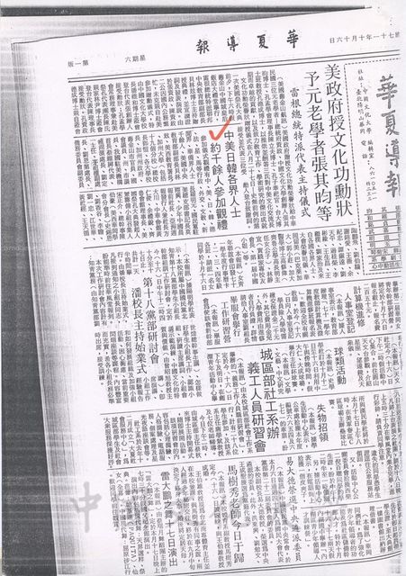 美國政府贈授文化功勳榮譽狀給中華民國三位元老學者-總統府資政、中國文化大學創辦人張其昀博士、孔孟學會理事長陳立夫博士、孔子奉祀官、台大博士班教授孔德成博士。文化功勳榮譽狀贈授儀式於民71年8月27日舉行。參加儀式觀禮有中、美、日、韓、德、法、星、馬等行政、外交、文教、新聞界、華僑界人士千餘人。