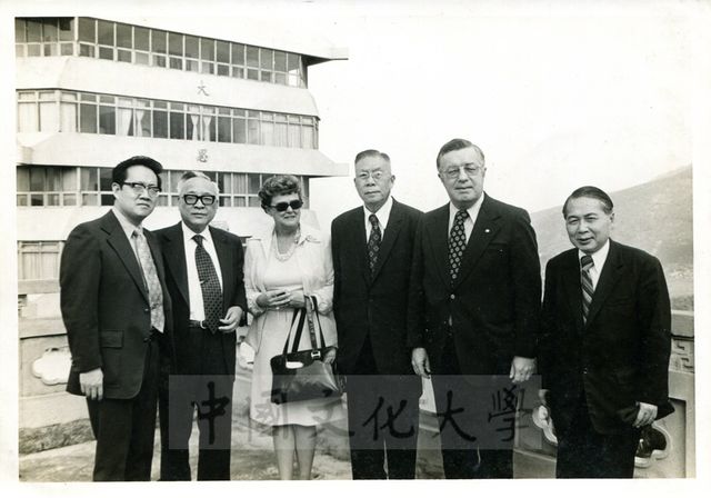 張創辦人與美國李海大學副校長人造雨專家齊蘭懋博士夫婦合影右為蕭師毅院長,左一二為薛昌明及薛光前博士。