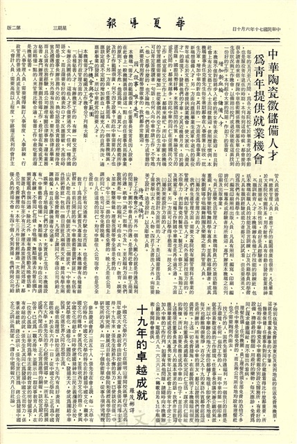 第一屆美學座談會明起假敬業堂舉行,柔道等社團速送改選資料,農業成果展覽放映四部影片,建築畢業設計展歡迎華岡人觀賞,總檢第一名之社團速至課指組領獎金,華岡博物館明展出范毅舜西畫甘二件,林國長獎學金今起受理申請,中華陶瓷爭儲備人才為青年提供就業機會,十九年的卓越成就
