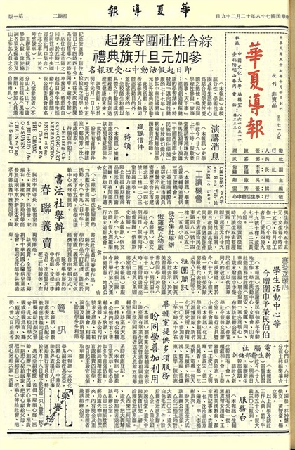 綜合性社團等發起 參加元旦升旗典禮,演講消息,疑誤信件待領,書法社舉辦春聯義賣,俄文學社舉辦俄羅斯文物展,學生活動中心等 今贈圍巾予榮民伯伯,畢輔室提供多項服務 盼同學善加利用,電腦社新生幹部儲訓,榮譽榜,詩情畫意的風信子石,驅動型式對行車性能之影響,大霸尖山隊員名單,爵士樂是音樂嗎?,法語朗誦賽 成績揭曉,文學院運動會 競賽優勝公布,華岡博物館 影片欣賞,站在我這邊/克莉絲汀的魅力 簡介,因愛心中來,形勢的樹立,華岡藝文趨向問卷調查結果,面對模特兒
