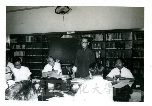 8月27日及8月29日為第一屆國際華學會議專題分組討論時程,假陽明山莊梨洲樓舉行,圖為8月29日下午哲學組於實踐圖書館參考室討論景況,立者為吳經熊教授。