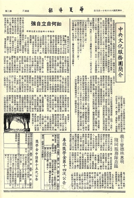 歡迎中央文化服務團蒞臨,中央文化服務團 今天上午抵華岡,演講,秋運會週五舉行 參加同學請準時,秋運會決賽各組名單公佈,文化服務團接受新聞館電視專訪,中央文化服務團簡介,如何自立自強,義士曾德林惠明隨同服務隊蒞臨,專設獎學金第十四次公告,獎學金申請第十五次公告