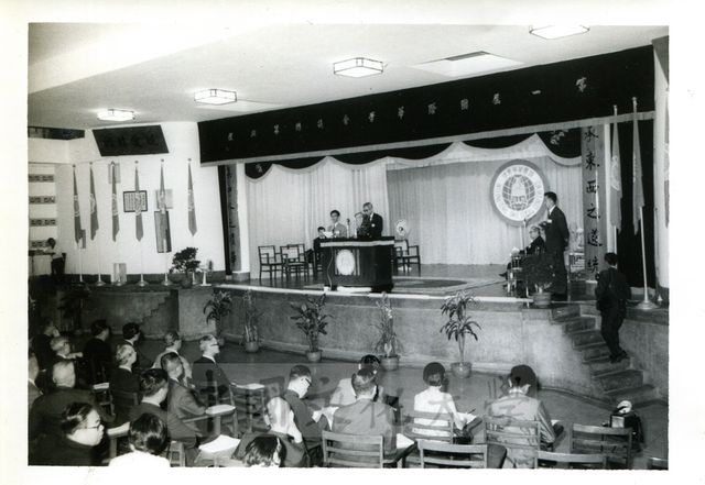 民國57年8月26日至30日,中華學術院主辦第一屆國際華學會議假華岡中國文化學院大成館舉行,參加的各國學人代表有二百一十二人,包括美、日、韓、菲、德、法等二十個國家及地區,大會由中華學術院院長張其昀主持,本次會議由二十六日進行至三十日。照片為第一屆國際華學會議-大會閉幕典禮,日籍代表岸邊成雄代表致詞,譯員為文化學院日籍學生前島浩。