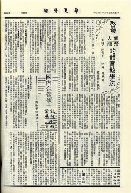生活輔導組呼籲同學注意安全及生活規範,為自由而跑報名至10日止,各社團負責人領年度計劃表,運動器材11日前歸還,12月份考勤統計表初步扣考名單今日受理更正,鹽水觀蜂炮受理預約報名,中國紙藝剪貼資料展歡迎參觀,寒假國術營即日起報名,弘道社今訪聖安娜之家,現代舞劇魚玄機今明繼續演出,大夏生輔組呼籲同學勿在走廊及教室吸菸,對校園民主的再澄清,本學期學術性社團活動統計表,減少感染之措施B型肝炎之治療,5箏的起源,淺談運動傷害,演講,啟發個人潛能的體育教學法,國內企管碩士就業發展與教育,國樂作曲獎15日前收件