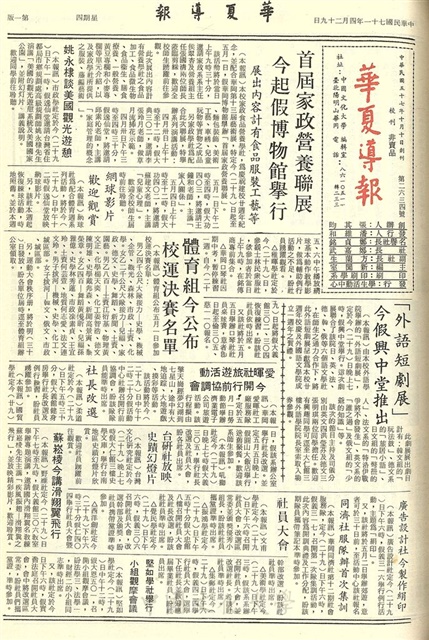 首屆家政營養聯展今起假博物館舉行,姚永棣談美國觀光遊憩,網球影片歡迎觀賞,體育組今公布校運決賽名單,「外語短劇展」今假興中堂推出,愛暉社旅遊活動今開行前協調會,社長改選,台研社放映史蹟幻燈片,蘇崧棱今講滑翔翼飛行,社員大會,廣告設計社今製作絹印,同濟社服隊辦首次集訓,堅如學社舉行小組觀摩會議,華岡校史上的今天,北朝書聖–鄭道昭,本校七十一學年度學生轉系標準表(下),重修電腦實習課同學速至會計室領繳費單
