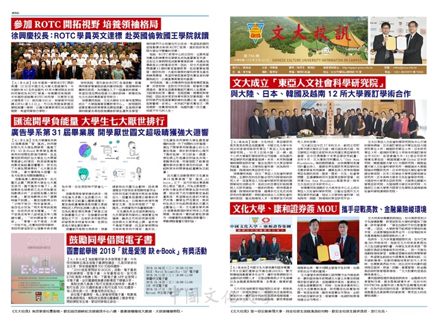 文大成立「東亞人文社會科學研究院」,文化大學、康和證券簽MOU ,One Asia基金會國際講座,華岡人的驕傲經濟系校友現任台灣大學校長管中閔,文大與方濟中學簽訂策略聯盟,文大GLORIA國際產官學協作,學生諮商中心[心靈診所],參加ROTC開拓視野培養領袖格局,匯流開學負能量大學生七大厭世排行,鼓勵同學借閱電子書