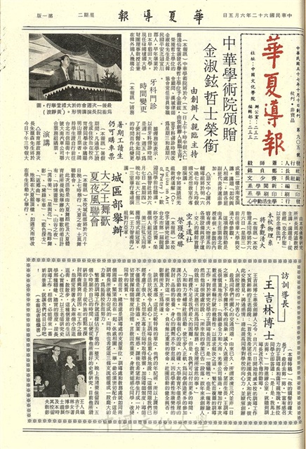 中華學術院頒贈金淑鉉哲士榮銜,暑期工讀生仍可購買車票,牙科門診時間變更,城區部舉辦大夏之夜土風舞聯歡會,本校物理系將參觀清大,空手道社榮獲優勝,訪訓導長 王吉林博士,歐洲史辭典 史學系編著完成,校友通訊(雅典)