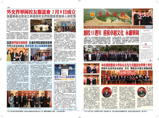 創校53週年迎接卓越文化永續華岡,總統賀電,副總統賀電,本校頒授慶南大學朴在圭先生名譽政治學學士學位,緬懷創辦人高瞻遠矚與創校之艱辛,創校53週年慶祝大會舞動華岡溫暖盛宴,采櫻文化傳承文化之美,外交界華岡校友聯誼會2月8日成立,首設澳門境外碩專班社會科學院開啟里程碑,校外Windows認證更便利