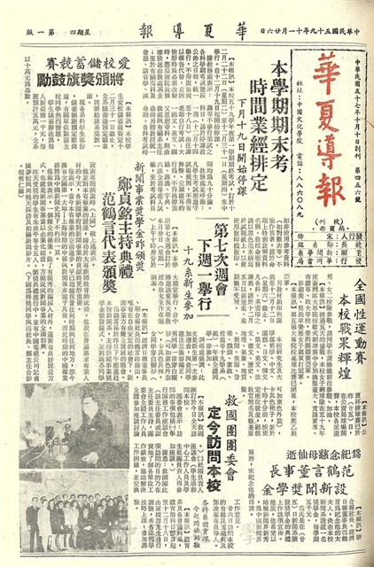 本學期期末考時間業經排定,愛校儲蓄競賽將頒獎旗鼓勵,第七次週會夏週一舉行,新聞室業獎學金昨頒獎鄭貞銘主持典禮范鶴言代表頒獎,全國性運動賽本校戰果輝煌,為紀念慈母仙逝范鶴董事長設新聞獎學金,救國團團委會今訪問本校,每週專訪社團負責人甘苦談,外界贈土資資源系參考書一批,高考榜首黃華勛忠孝傳家有名聲,簡訊