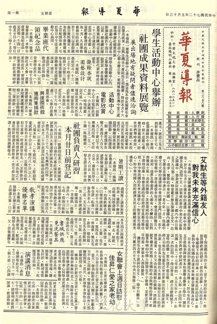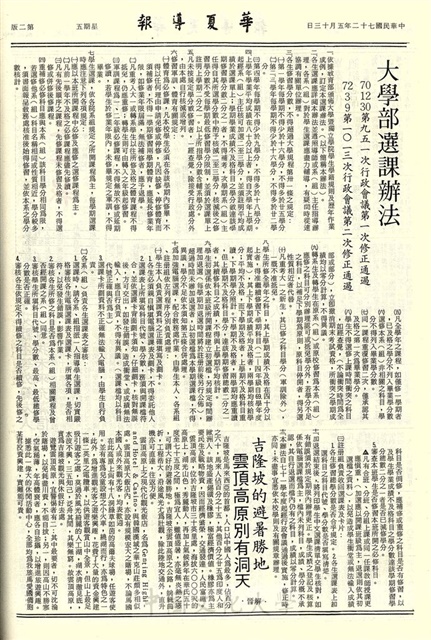 學生活動中心舉辦社團成果資料展覽,饒餘杏談園藝設計,興建國術館獲兩筆捐款,社團負責人研習本月廿日前登記,艾默生等外籍友人對我未來充滿信心,女聯會上週日訪慰佳昇仁愛之家老幼,演講消息,大學部選課辦法,吉隆坡的避暑勝地,雲頂高原別有洞天,勞榦院士今演講:開發簡牘學術.宏揚中華歷史,21世紀的三輪汽車,七十一學年度第二學期獎學金申請第八次公告,給大四同學(之二),私刻或盜用別人印章該當何罪,象徵幸運到來的燕子花