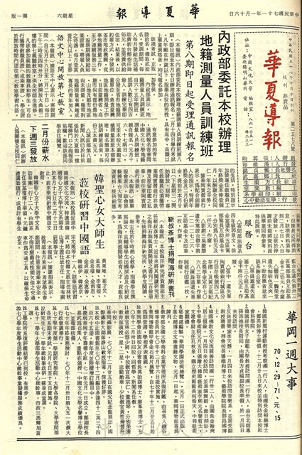 內政部委託本校辦理地籍測量人員訓練班,語文中心開放第七教室,二月份薪水下週三發放,韓聖心女大師生蒞校研習中國語,服務台,靳叔彥博士捐贈海研所書刊,華岡一週大事,曉公夫子八秩晉一雙慶,于衡獻身新聞工作堅守絕不扯謊信條,中國文化大學圖書統計表,建校廿週年藝文展 歡迎踴躍提供作品