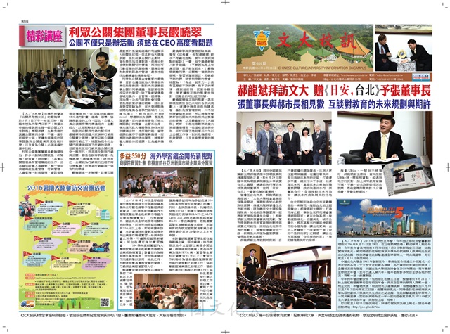 郝龍斌拜訪文大贈《日安,台北》予張董事長,CCU GLOBAL 2015 ALUMNI REUNION,社科學院跨12學院共同舉辦大師講座,2015美國暑期實習Work&Travel來囉,響應節約用水全校一起動起來,學海飛颺視野看更廣,學生諮商中心[心靈診所],利眾公關集團董事長嚴曉翠,2015暑期大陸參訪交流團活動,多益550分海外學習鍍金開拓新視野
