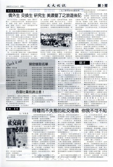 學術交流又創佳績 本校與烏克蘭歐洲財經資訊大學締結姊妹校,敦親睦鄰 社區互動由本校認養華岡、格致路口清潔工作談起,教職員自強活動 九州賞櫻溫泉物語,充滿詩意的別府之夜,相逢自是有緣 僑外生 交換生 研究 美濃墾丁之旅後記,書鄉‧書香 社交高手必修課,畫眼看自然,校友專訪 善盡本分 認真負責 福報便自來,暢所欲顏,撼動華岡、艷夏饗宴 本校第一屆康樂類暨學藝類社團聯合成果展,文化大學英語遊學團第一品牌,生活新知 你喜吃醋嗎?,網路特搜隊 網路也有拉麵香,水質檢測合格,請師生安心用,HiNet 帳號申請辦,再次到校服務,推動藝文 備受肯定 本校榮獲第三屆文馨獎金