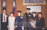 1994年3月1日悟明長老(李林泉先生)獲頒本校名譽哲學博士學位與董事長張鏡湖等人合影留念